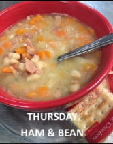 Cup or Bowl Sunday-Chili, Tuesday-Taco Soup, Wednesday-Loaded Baked Potato, Thursday-ham & Bean w/ warm Cornbread, Friday Vegetable, Saturday-Chicken with Wild Rice.